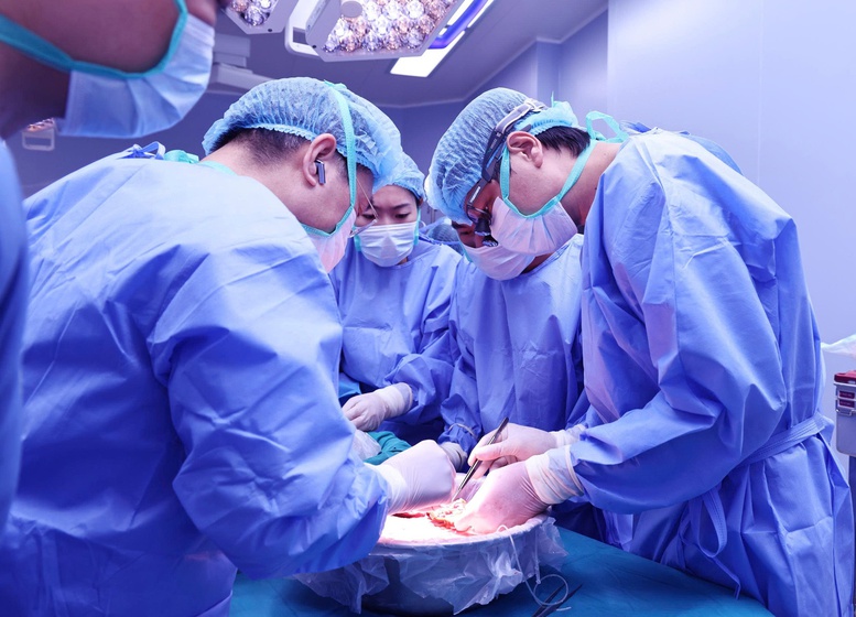 Các bác sĩ thực hiện kỹ thuật chia gan để ghép cho 2 ca bệnh hiểm nghèo – Ảnh: VGP.