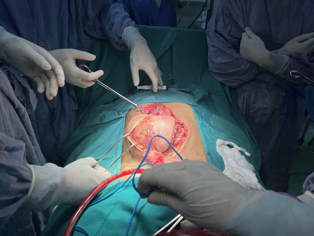 Trước đó, ngày 2/12, bệnh nhân nhập viện trong tình trạng đau đớn dữ dội do khối u lớn vùng bụng, không thể ăn uống, mất ngủ kéo dài. Người bệnh có tiền sử viêm gan B từ nhỏ nhưng đến tháng 6/2023 mới phát hiện. Thời điểm đó, bệnh nhân từng được phẫu thuật cấp cứu cắt khối u gan vỡ tại bệnh viện tuyến tỉnh. Tuy nhiên, sau khoảng 6 tháng, khối u tái phát. Thay vì tiếp tục điều trị y tế, bệnh nhân trở về nhà, áp dụng các phương pháp dân gian như uống thuốc nam, đắp lá, cúng bái…, khiến khối u phát triển nhanh, kích thước ngày càng lớn.